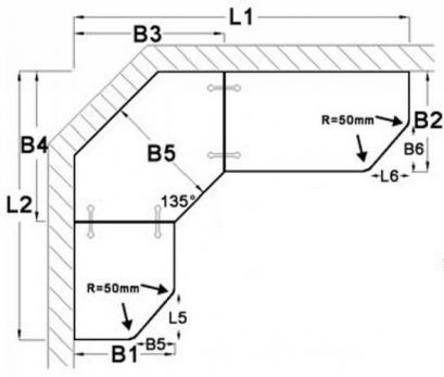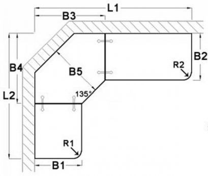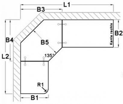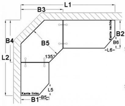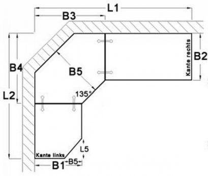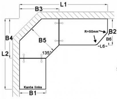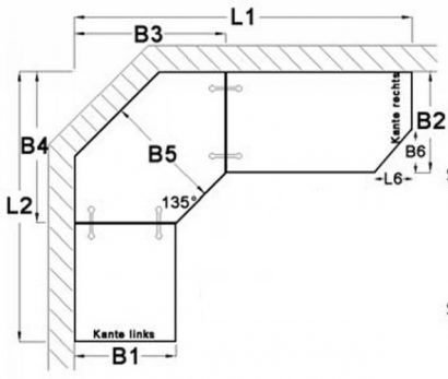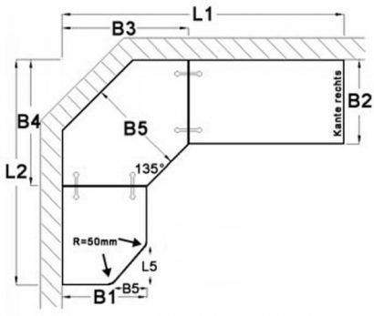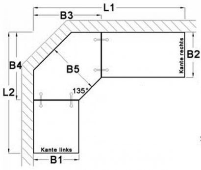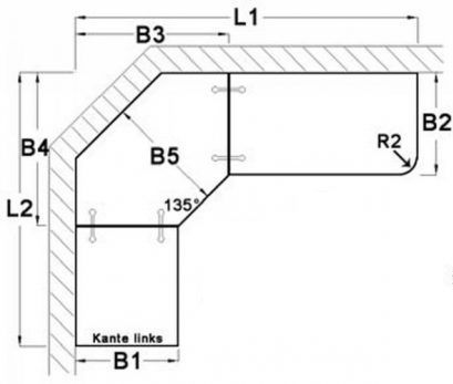 Bei Ihrer Anfrage geben Sie Ihre Eckunterschrank Maße an – in unseren Beispielzeichnungen wären es 90 x 90 cm /Die Platteneinstände bei den jeweiligen Verbindungsfräsungen werden automatisch von unserm Programm berücksichtigt. Ist der Einbau einer größeren Eckspüle vorgesehen, so sollte eine Sinus-Eckverbindung ausgewählt werden. Der Aufpreis von Standard auf Sinus beträgt ca. 80 € (Gerne beraten wir Sie hierzu auch telefonisch)